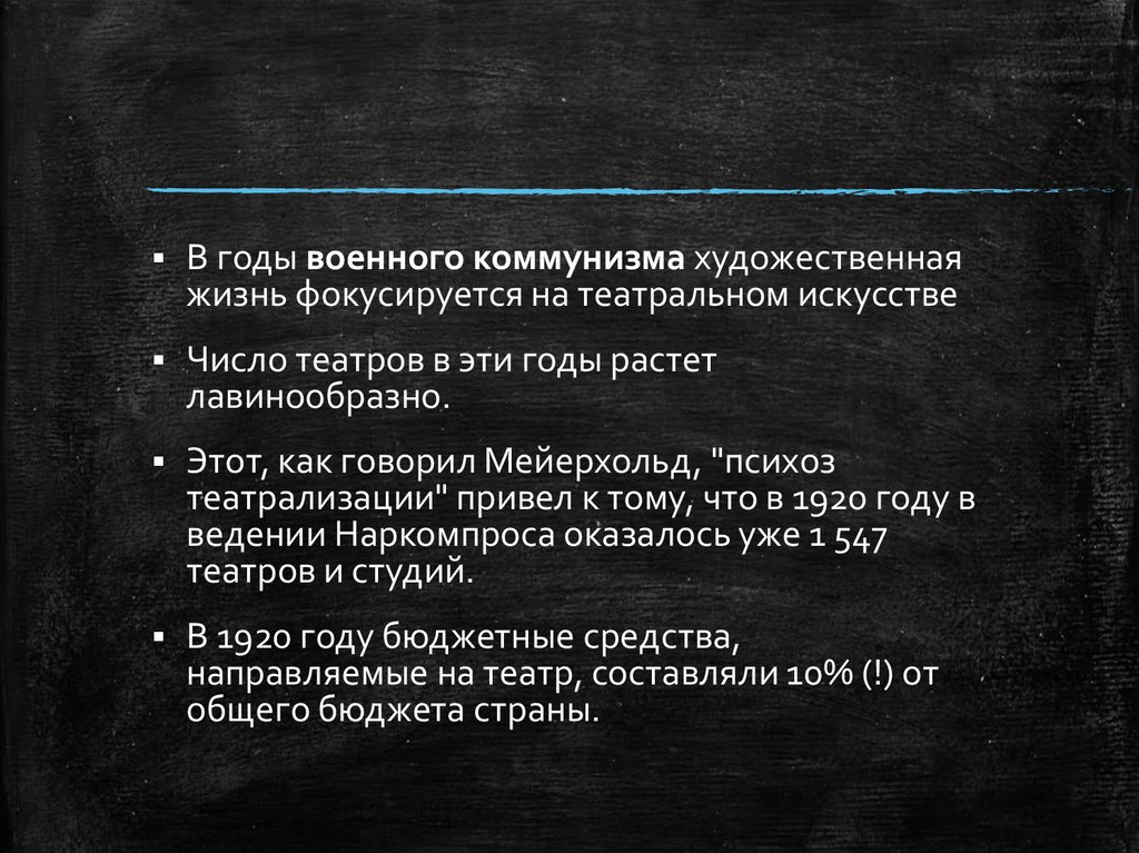 В годы военного коммунизма художественнаяжизнь фокусируется на театральном искусстве