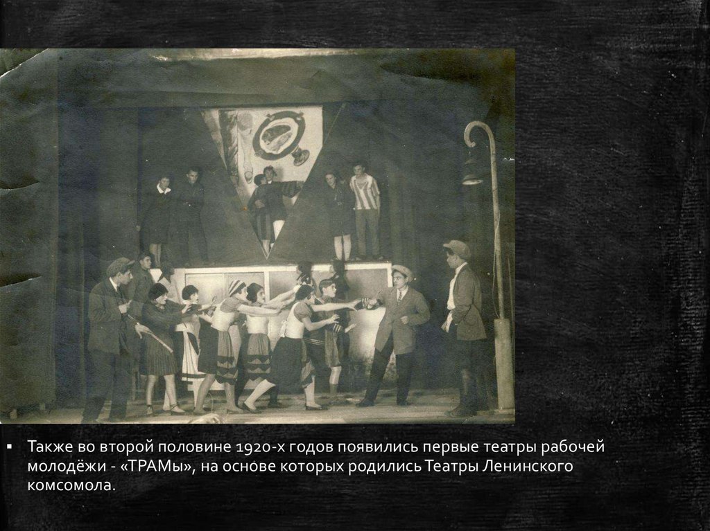 Также во второй половине 1920-х годов появились первые театры рабочеймолодёжи - «ТРАМы», на основе которых родились Театры Ленинского