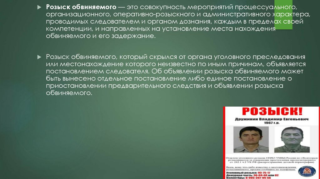 Розыск обвиняемого — это совокупность мероприятий процессуального,организационного, оперативно-розыскного и административного характера,