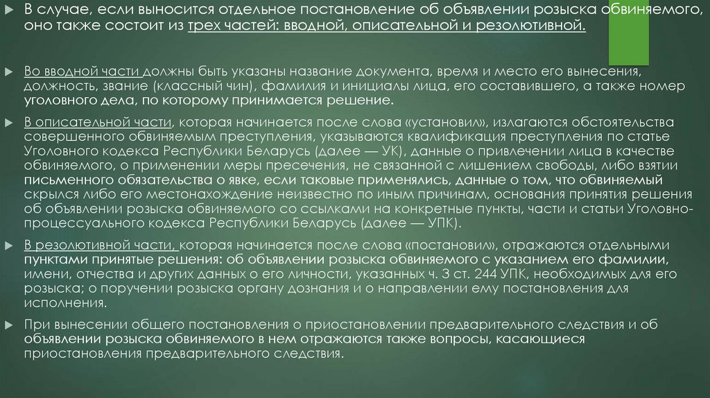 об объявлении розыска обвиняемого со ссылками на конкретные пункты, части и статьи Уголовнопроцессуального кодекса Республики Беларусь (далее — УПК).