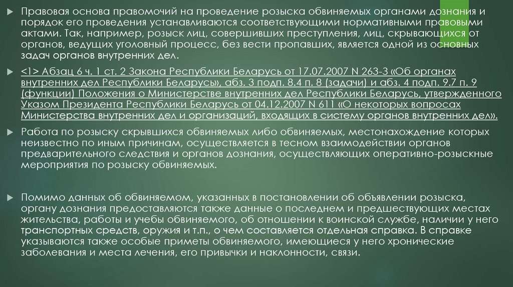 Правовая основа правомочий на проведение розыска обвиняемых органами дознания ипорядок его проведения устанавливаются соответствующими нормативными правовыми