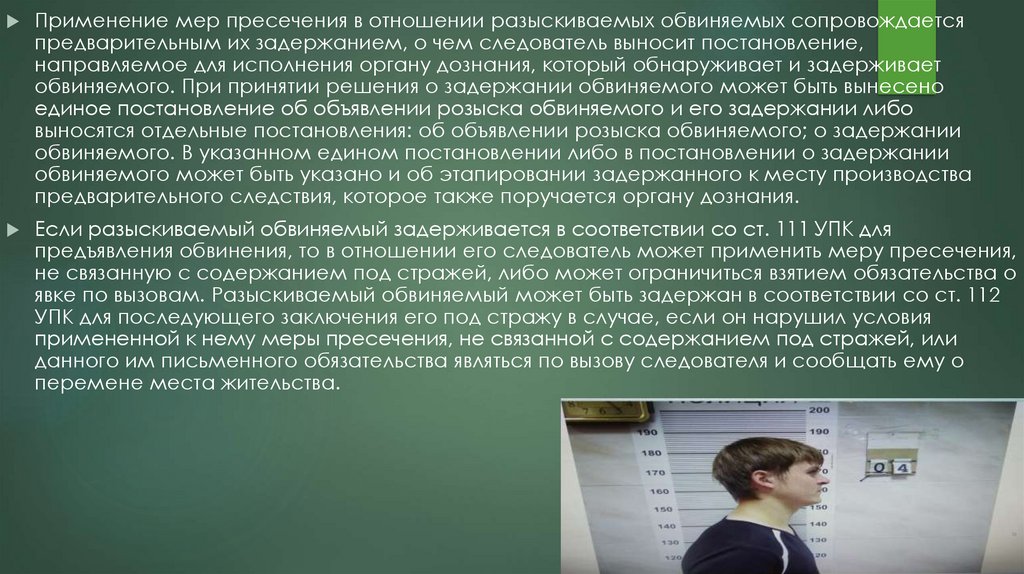 Применение мер пресечения в отношении разыскиваемых обвиняемых сопровождаетсяпредварительным их задержанием, о чем следователь выносит постановление,