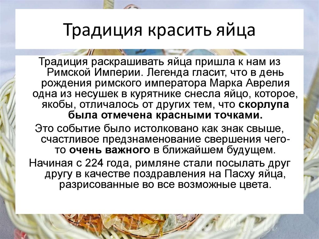 Традиция раскрашивать яйца пришла к нам изРимской Империи. Легенда гласит, что в день