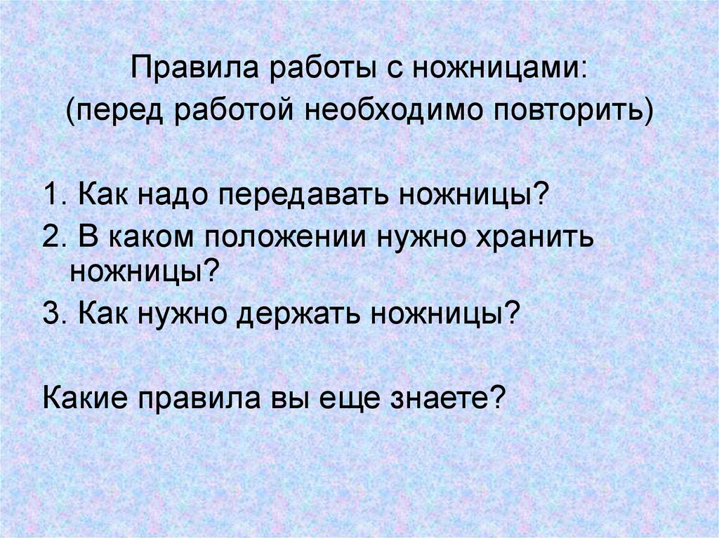 Правила работы с ножницами:(перед работой необходимо повторить)