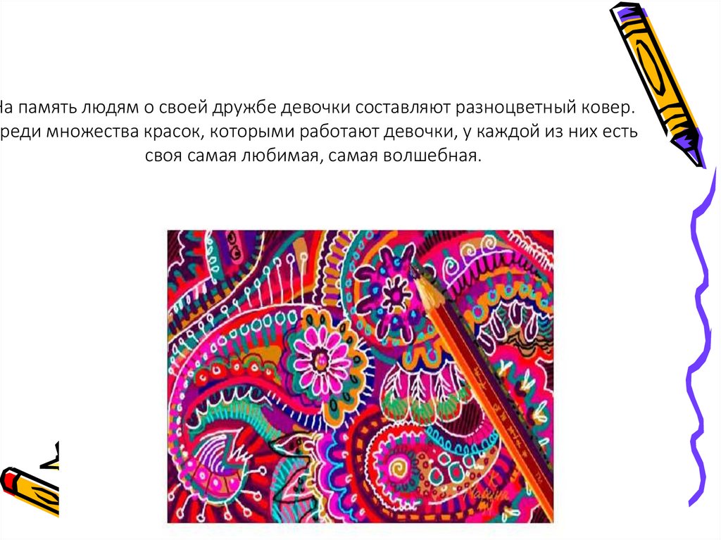 На память людям о своей дружбе девочки составляют разноцветный ковер.Среди множества красок, которыми работают девочки, у каждой из них есть