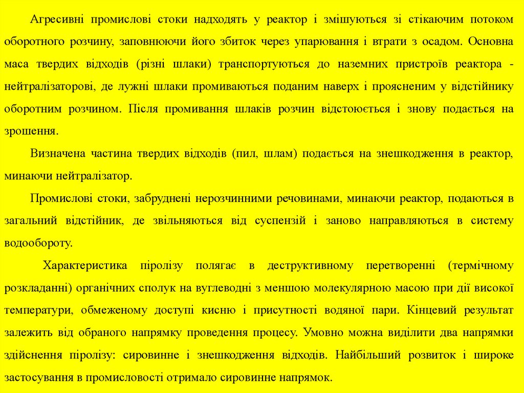маса твердих відходів (різні шлаки) транспортуються до наземних пристроїв реактора нейтралізаторові, де лужні шлаки промиваються поданим наверх і проясненим у відстійнику