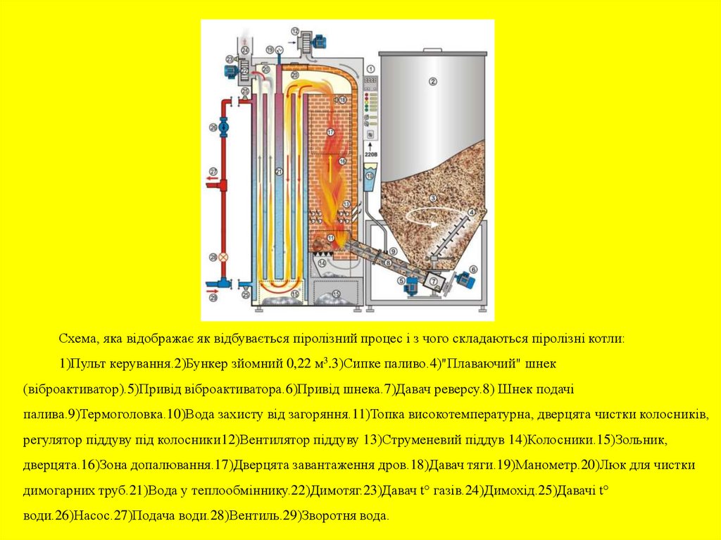 Схема, яка відображає як відбувається піролізний процес і з чого складаються піролізні котли:1)Пульт керування.2)Бункер зйомний 0,22 м3.3)Сипке паливо.4)"Плаваючий" шнек