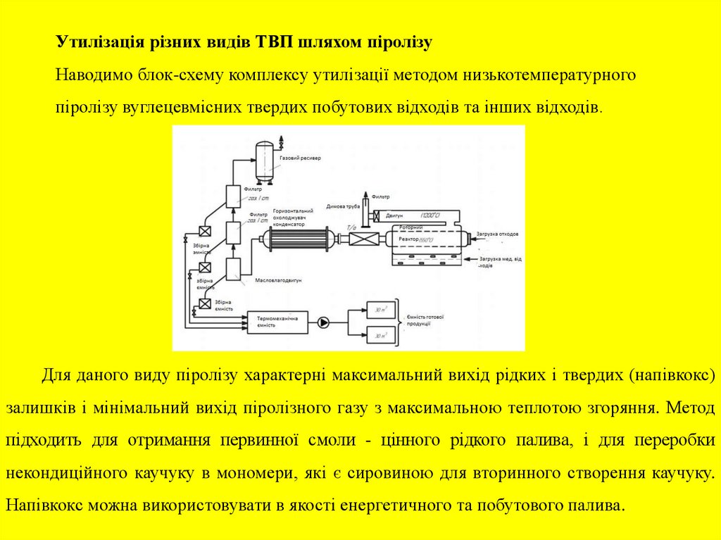 Утилізація різних видів ТВП шляхом піролізуНаводимо блок-схему комплексу утилізації методом низькотемпературного