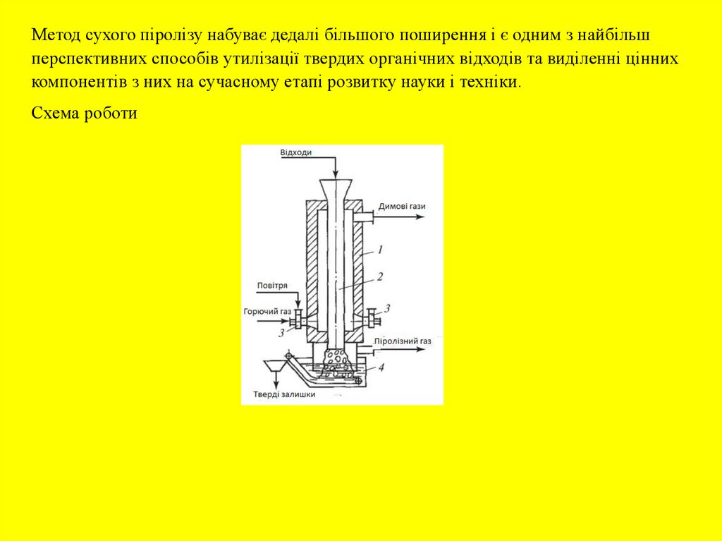 Метод сухого піролізу набуває дедалі більшого поширення і є одним з найбільшперспективних способів утилізації твердих органічних відходів та виділенні цінних