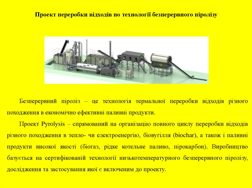 Проект переробки відходів по технології безперервного піролізуБезперервний піроліз – це технологія термальної переробки відходів різного