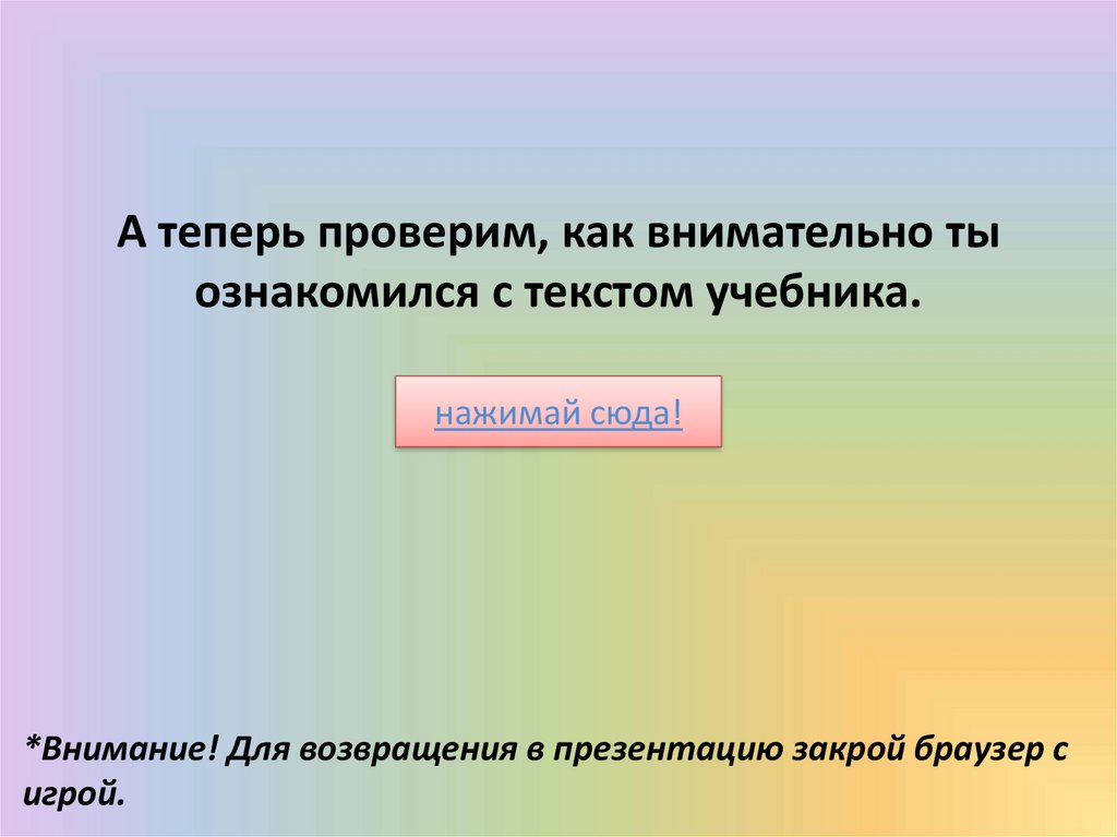 А теперь проверим, как внимательно тыознакомился с текстом учебника.