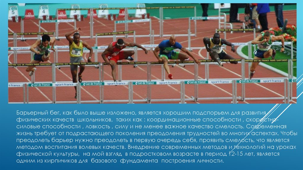 Барьерный бег, как было выше изложено, является хорошим подспорьем для развитияфизических качеств школьников, таких как : координационные способности , скоростносиловые способности , ловкость , силу и не менее важное качество смелость. Современная