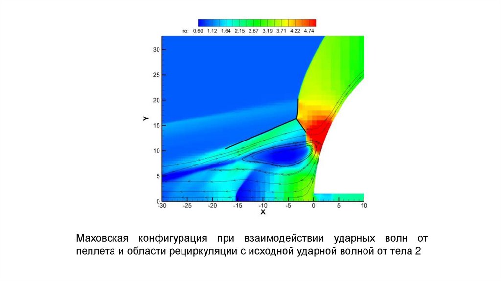 Маховская конфигурация при взаимодействии ударных волн отпеллета и области рециркуляции с исходной ударной волной от тела 2