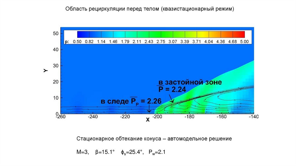 Распределение давления с линиями тока (продолжение, стадияуменьшения и исчезновения области рециркуляции перед телом)