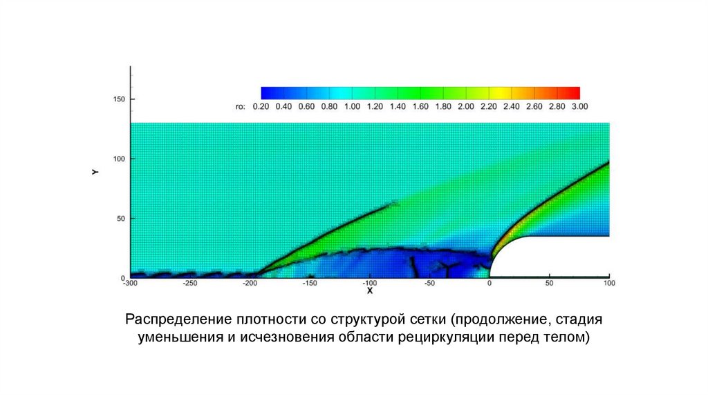 Распределение плотности со структурой сетки (продолжение, стадияуменьшения и исчезновения области рециркуляции перед телом)