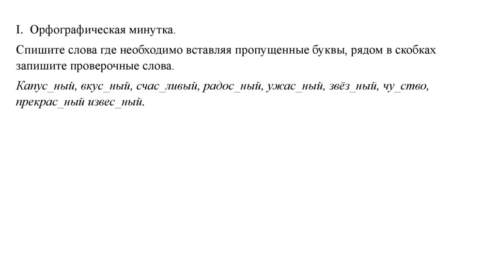 I. Орфографическая минутка.Спишите слова где необходимо вставляя пропущенные буквы, рядом в скобках