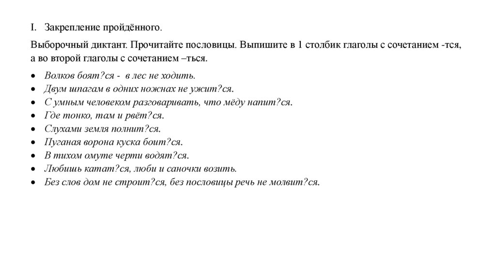I. Закрепление пройдённого.Выборочный диктант. Прочитайте пословицы. Выпишите в 1 столбик глаголы с сочетанием -тся,