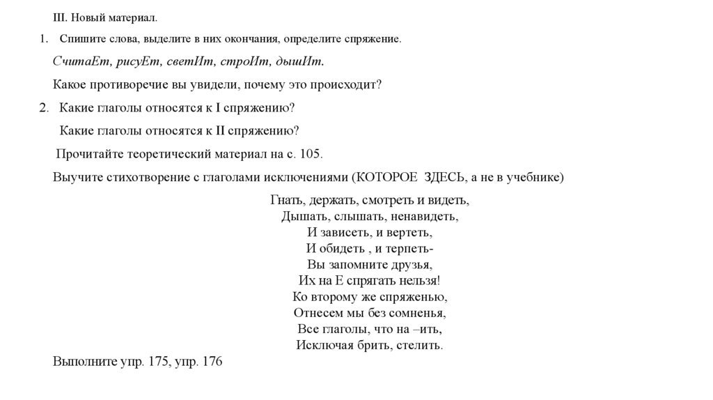 III. Новый материал.1. Спишите слова, выделите в них окончания, определите спряжение.