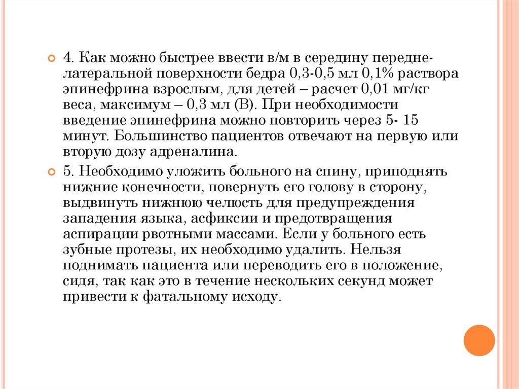 4. Как можно быстрее ввести в/м в середину переднелатеральной поверхности бедра 0,3-0,5 мл 0,1% раствораэпинефрина взрослым, для детей – расчет 0,01 мг/кг