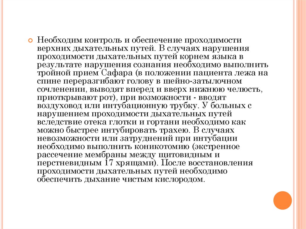 Необходим контроль и обеспечение проходимостиверхних дыхательных путей. В случаях нарушения