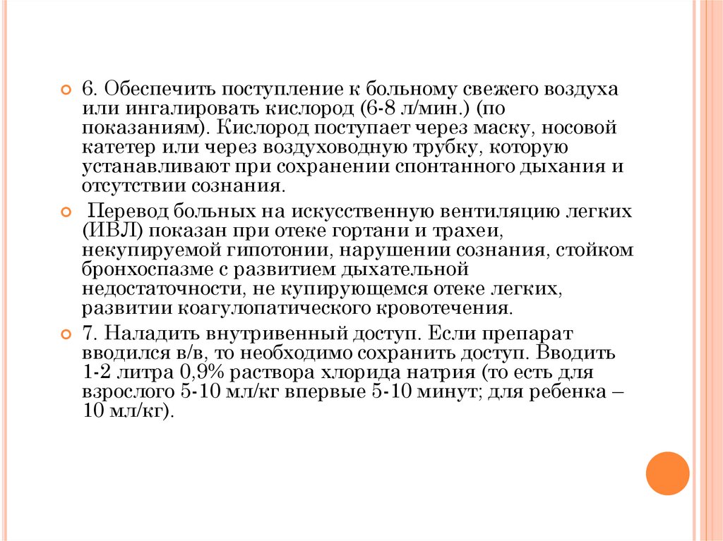 6. Обеспечить поступление к больному свежего воздухаили ингалировать кислород (6-8 л/мин.) (по