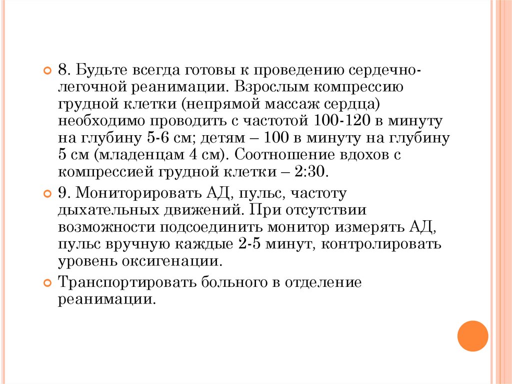 8. Будьте всегда готовы к проведению сердечнолегочной реанимации. Взрослым компрессиюгрудной клетки (непрямой массаж сердца)