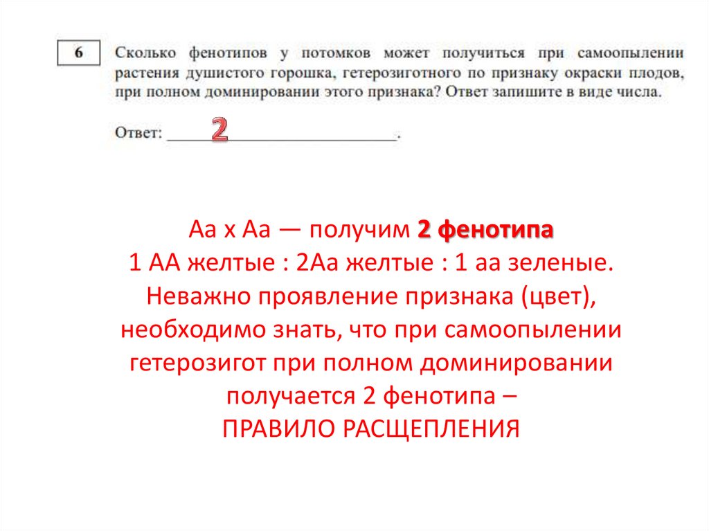 Аа х Аа — получим 2 фенотипа1 АА желтые : 2Аа желтые : 1 аа зеленые.