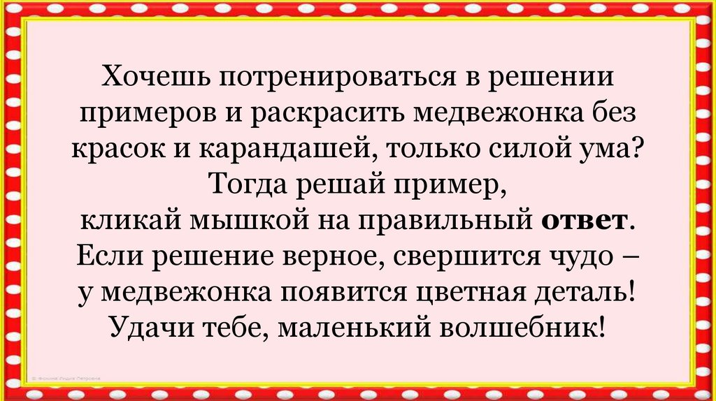 Хочешь потренироваться в решениипримеров и раскрасить медвежонка без