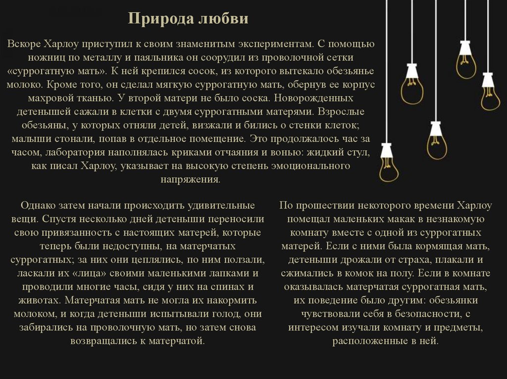 Природа любвиВскоре Харлоу приступил к своим знаменитым экспериментам. С помощью