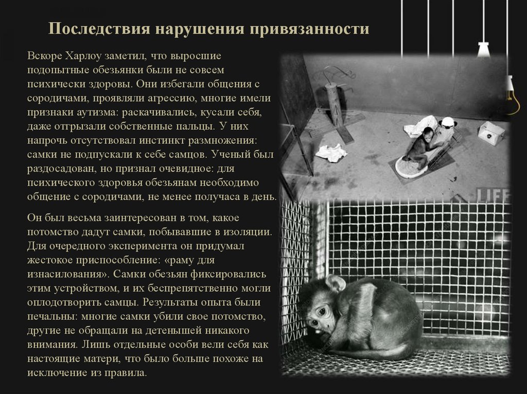 Последствия нарушения привязанностиВскоре Харлоу заметил, что выросшие