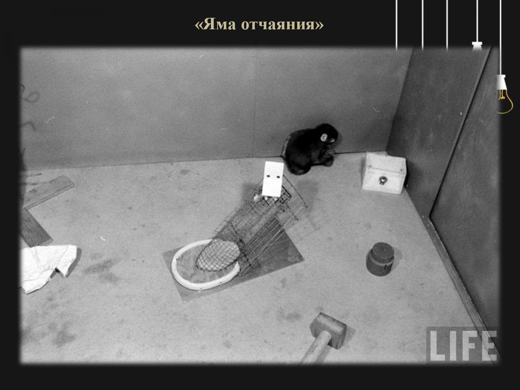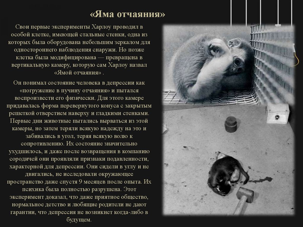 «Яма отчаяния»Свои первые эксперименты Харлоу проводил в