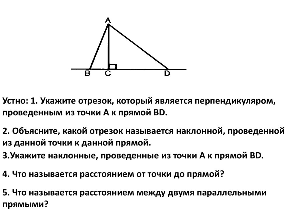 Устно: 1. Укажите отрезок, который является перпендикуляром,проведенным из точки А к прямой BD.