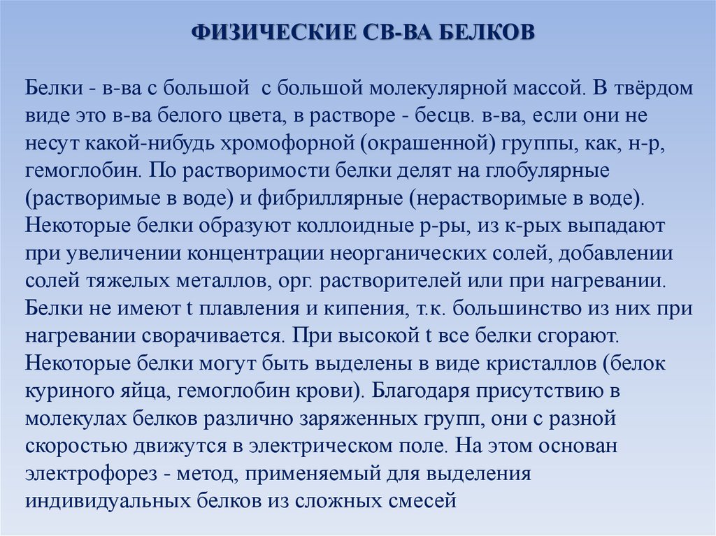ФИЗИЧЕСКИЕ СВ-ВА БЕЛКОВБелки - в-ва с большой с большой молекулярной массой. В твёрдом
