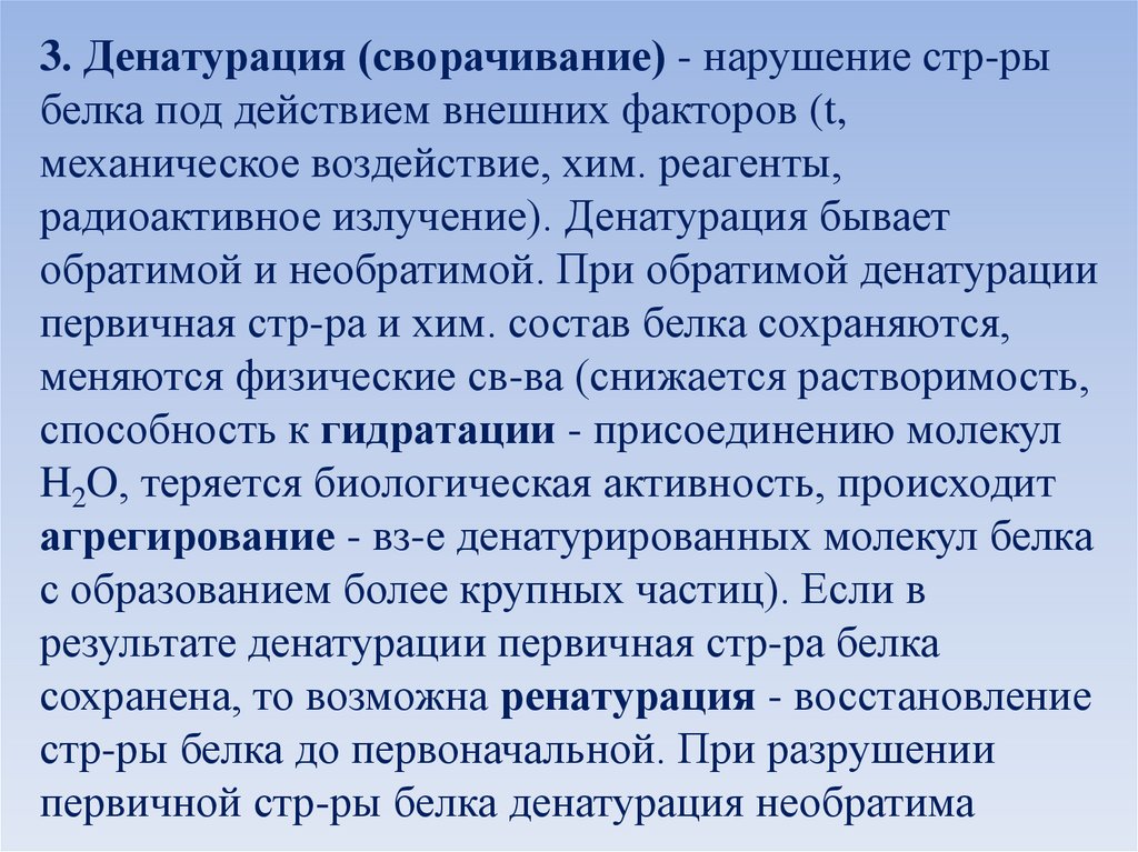3. Денатурация (сворачивание) - нарушение стр-рыбелка под действием внешних факторов (t,