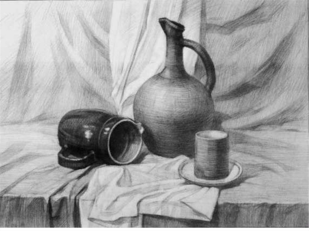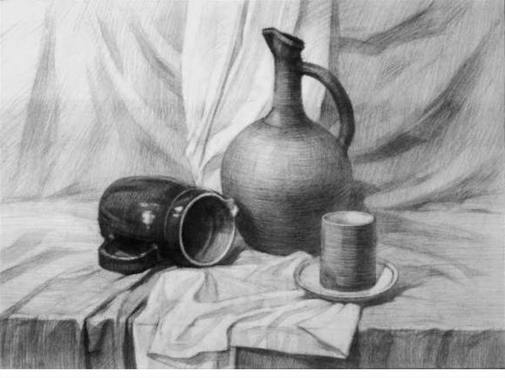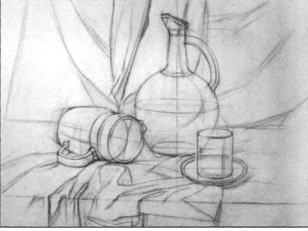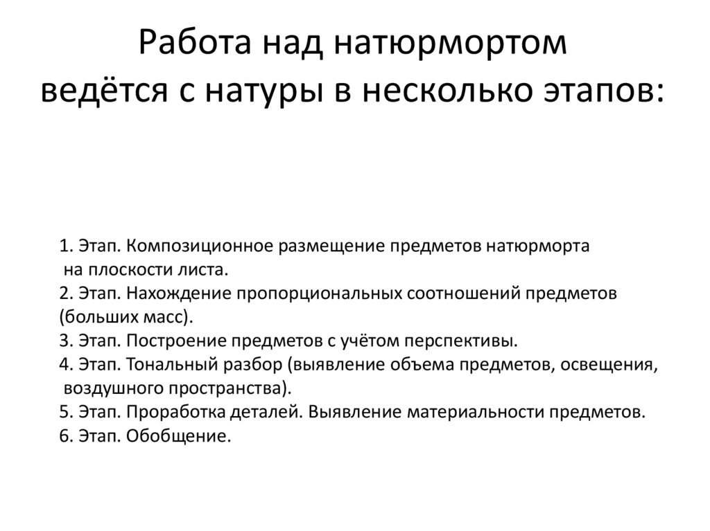 Работа над натюрмортомведётся с натуры в несколько этапов: