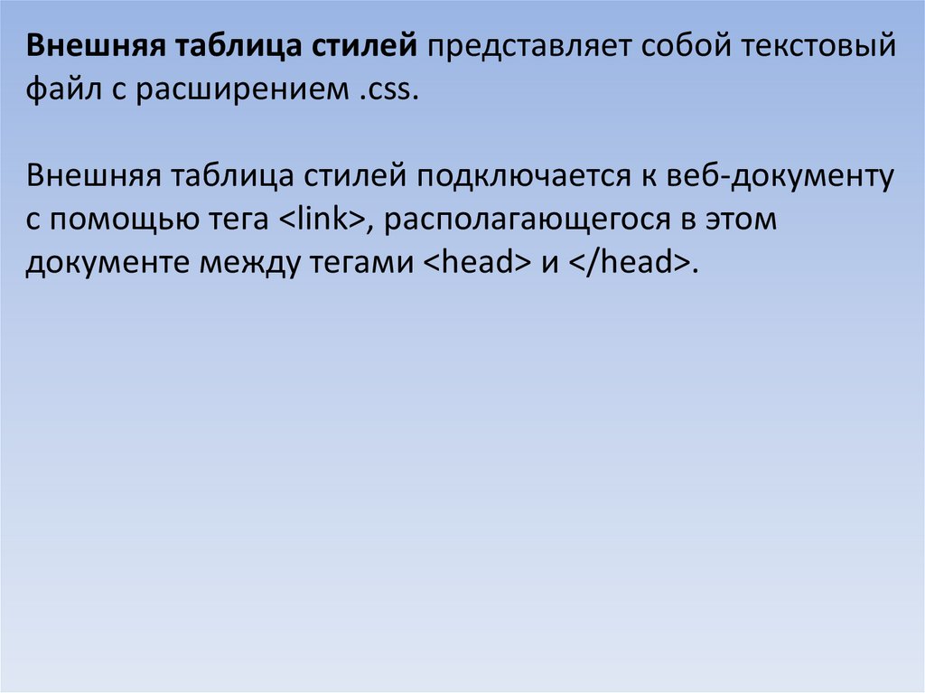 Внешняя таблица стилей представляет собой текстовыйфайл с расширением .css.