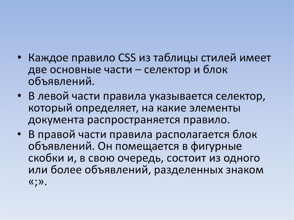 • Каждое правило CSS из таблицы стилей имеетдве основные части – селектор и блок