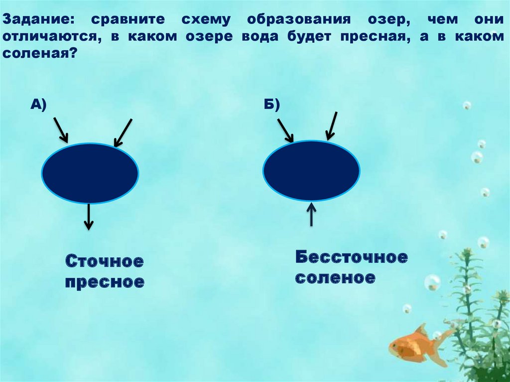 Задание: сравните схему образования озер, чем ониотличаются, в каком озере вода будет пресная, а в каком