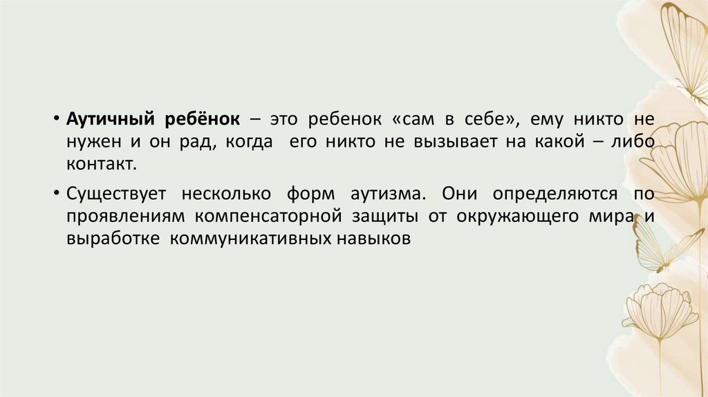 • Аутичный ребёнок – это ребенок «сам в себе», ему никто ненужен и он рад, когда его никто не вызывает на какой – либо