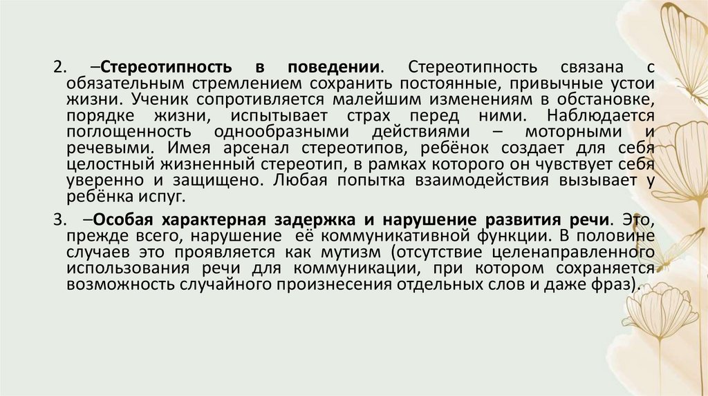 2. –Стереотипность в поведении. Стереотипность связана собязательным стремлением сохранить постоянные, привычные устои