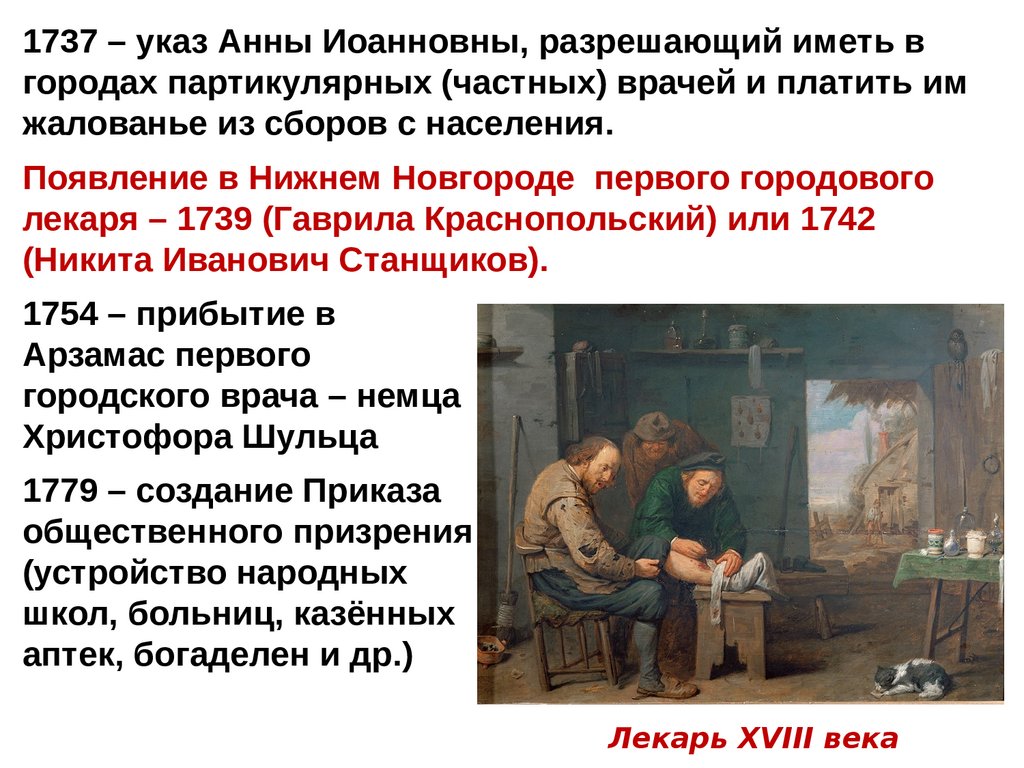 1737 – указ Анны Иоанновны, разрешающий иметь вгородах партикулярных (частных) врачей и платить им