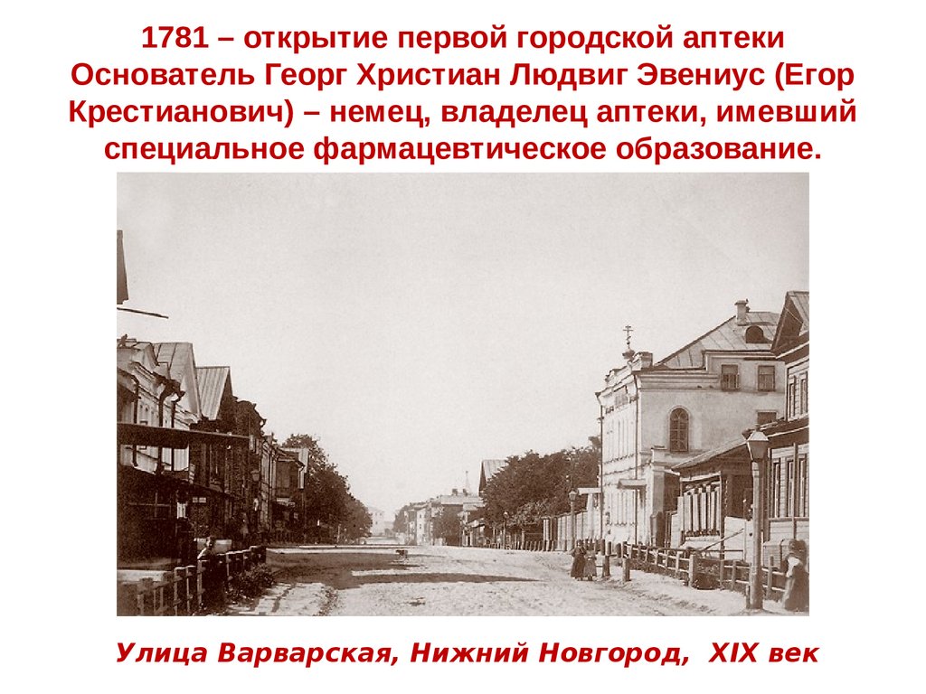 1781 – открытие первой городской аптекиОснователь Георг Христиан Людвиг Эвениус (Егор