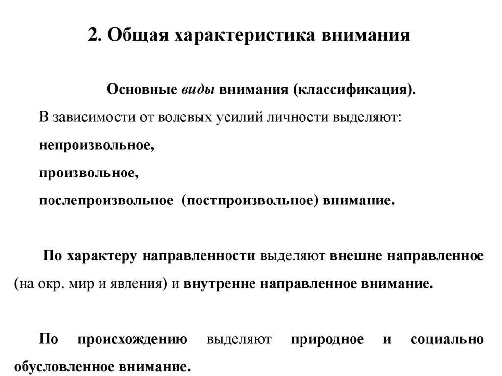 2. Общая характеристика вниманияОсновные виды внимания (классификация).