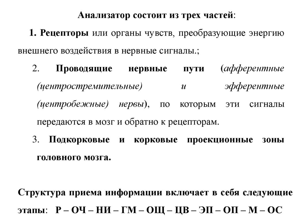 Анализатор состоит из трех частей:1. Рецепторы или органы чувств, преобразующие энергию