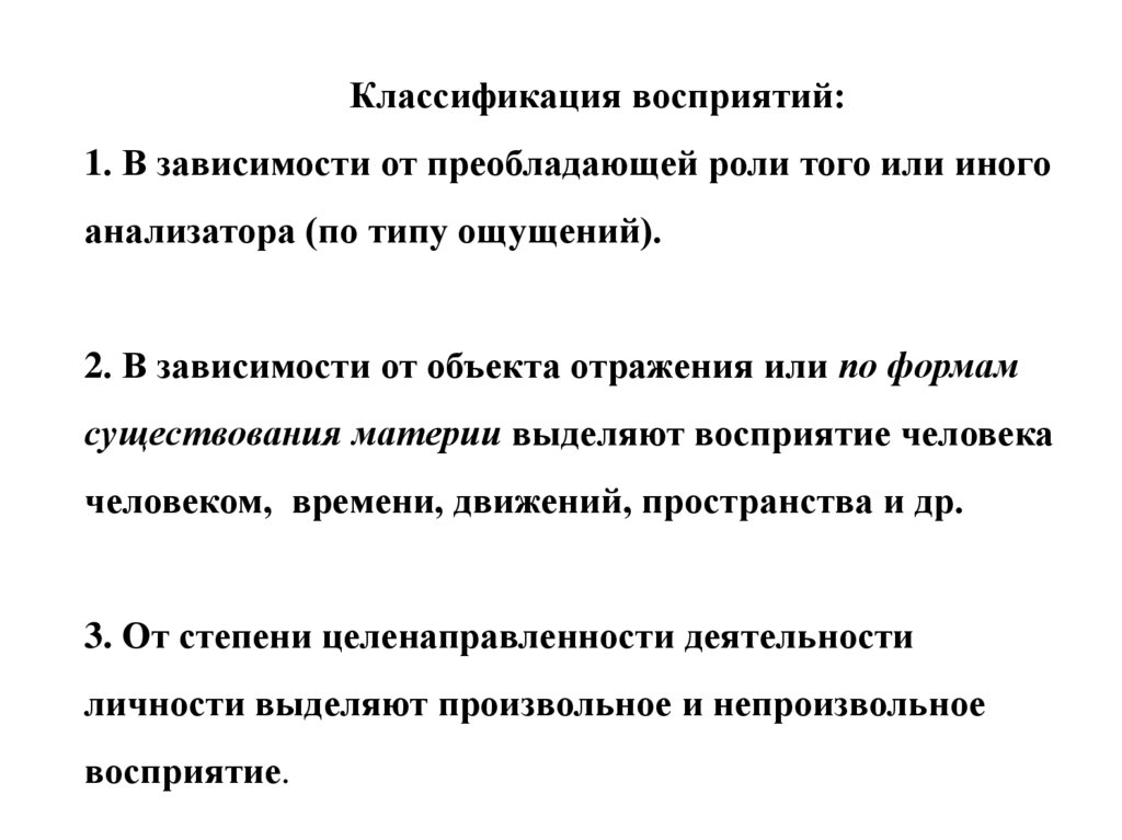 Классификация восприятий:1. В зависимости от преобладающей роли того или иного