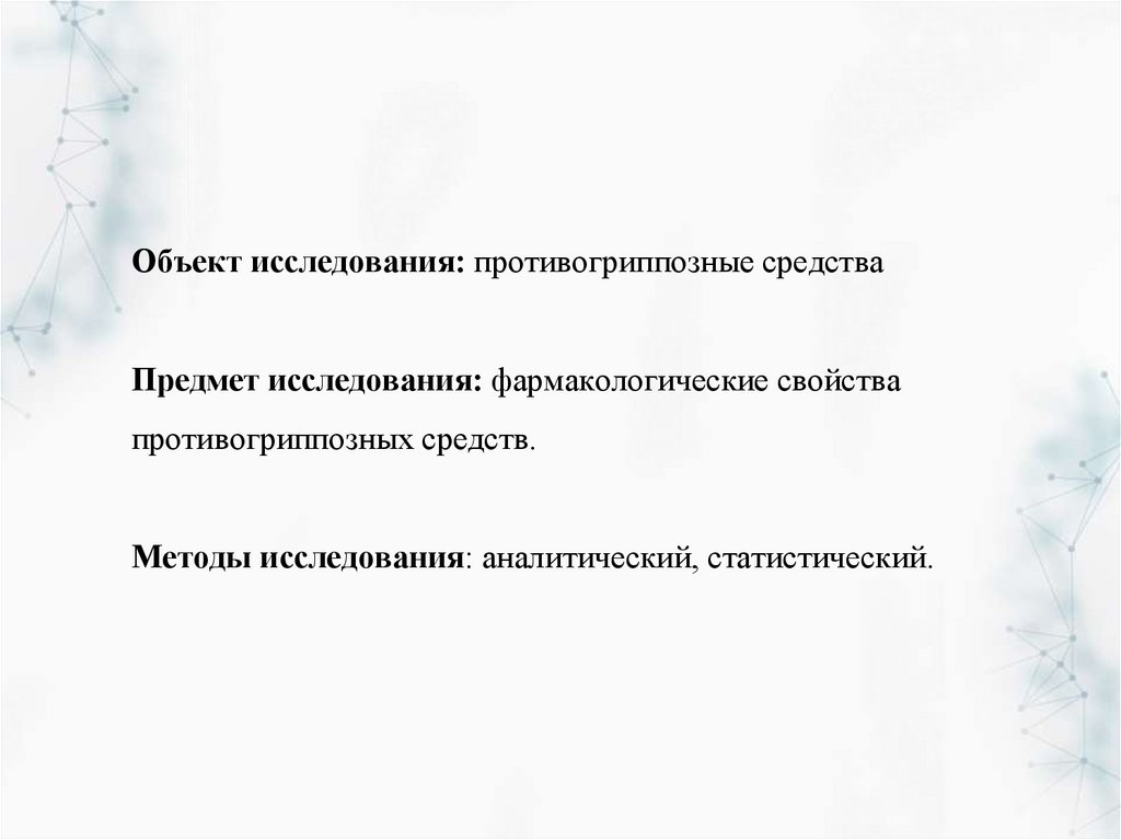 Объект исследования: противогриппозные средстваПредмет исследования: фармакологические свойства