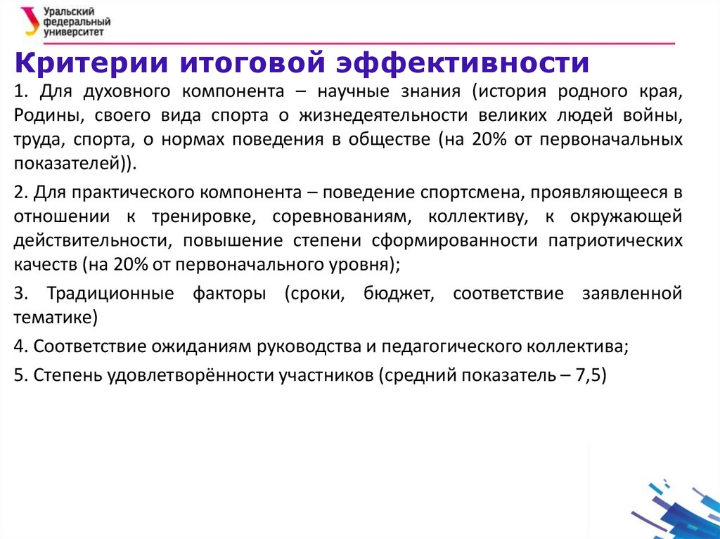 Критерии итоговой эффективности1. Для духовного компонента – научные знания (история родного края,