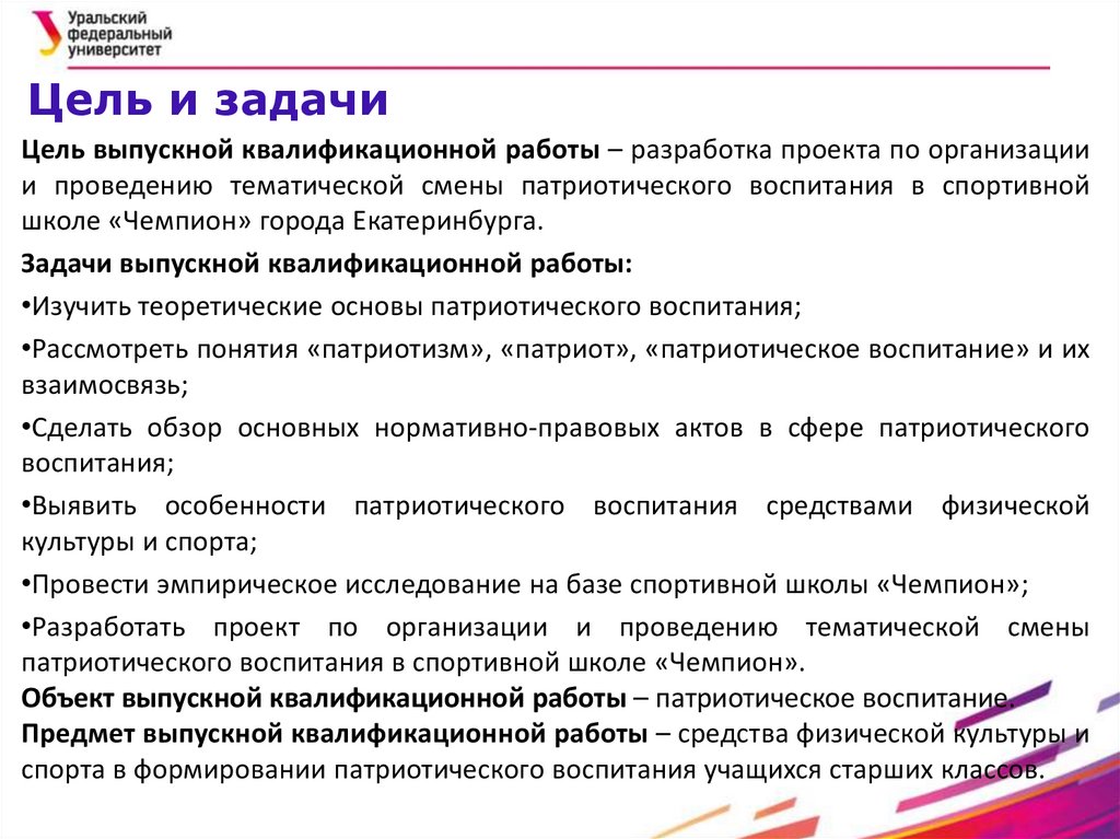 Объект выпускной квалификационной работы – патриотическое воспитание.