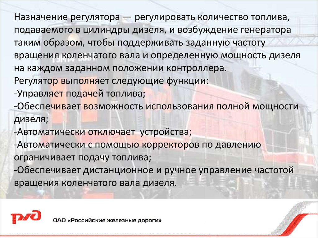 Назначение регулятора — регулировать количество топлива,подаваемого в цилиндры дизеля, и возбуждение генератора
