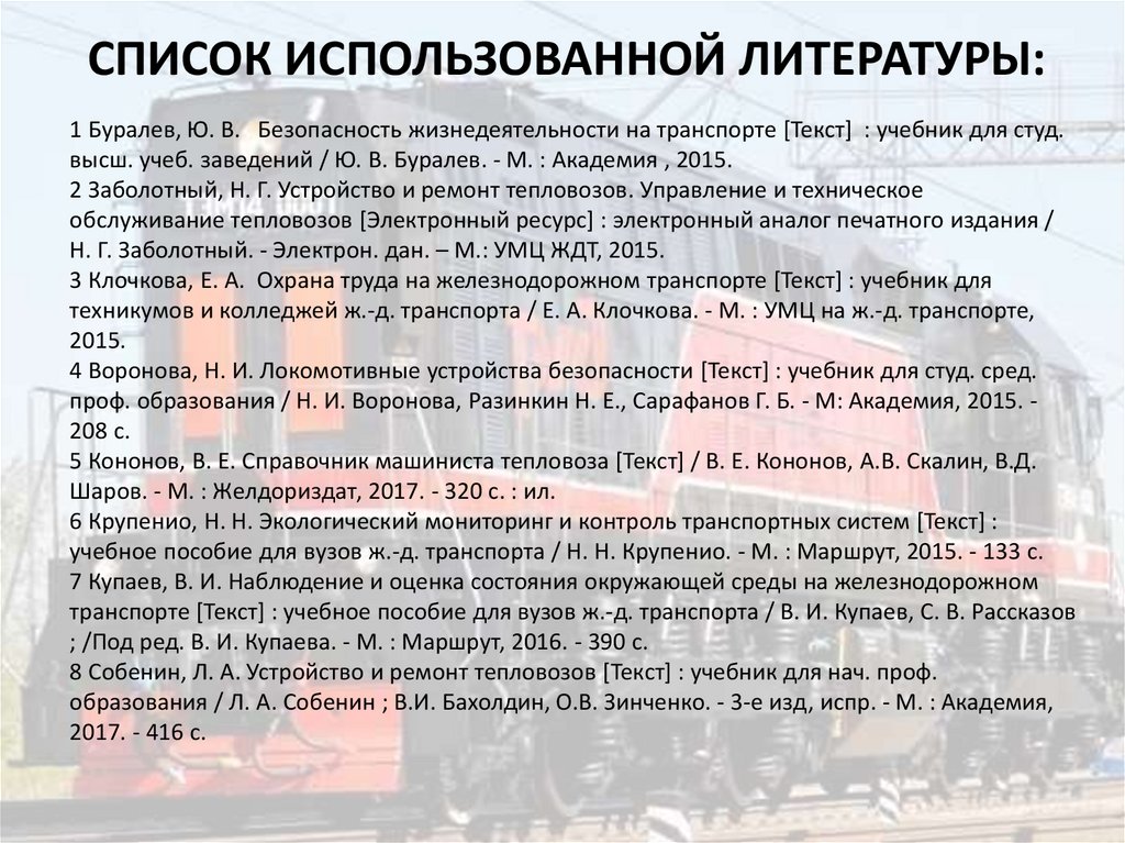 СПИСОК ИСПОЛЬЗОВАННОЙ ЛИТЕРАТУРЫ:1 Буралев, Ю. В. Безопасность жизнедеятельности на транспорте [Текст] : учебник для студ.